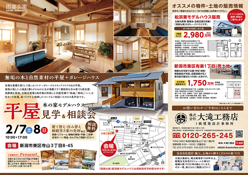 大滝工務店さんは、地元新潟市で50年以上、 大滝工務店さんは、地元新潟市を中心に毎日を暖かく快適に過ごせる木の家づくりを行っています。無垢の木と漆喰、自然素材の「雨楽な家」、新潟の寒さにも耐えうる断熱材を用いた注文住宅、リフォーム・リノベーション。地域に根付いた工務店だからこそできる小回りの利くアフターサポート、充実の保険と保証もご用意。安心して家づくりをお任せいただける体制を整えています。詳しくはホームページをご覧ください。 |