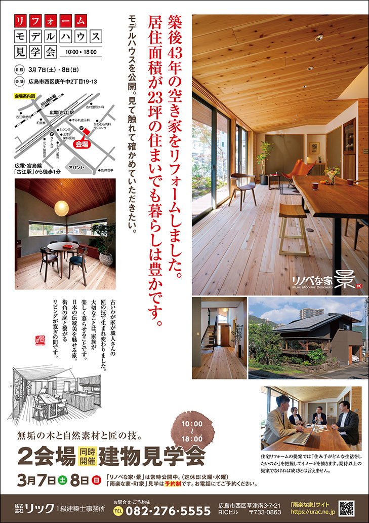 会場1:「リノベな家・景」モデルハウス 所在地:広島県広島市西区庚午中2丁目19-13 会場2:「雨楽な家・町家」 所在地:広島県広島市西区草津浜町 |