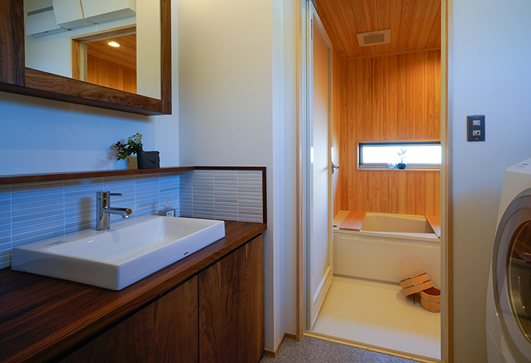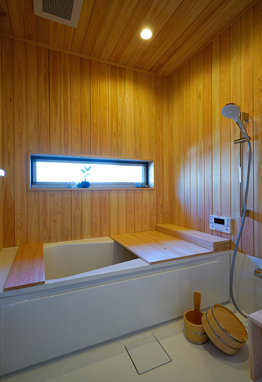 広島市西区のリノベーションモデルハウス「アトリエ景・古江」のお風呂は1坪タイプのハーフユニットバス。浴室下部分に浴槽と洗い場が一体化した既製品を使い、上部分は在来工法で壁と天井に桧の板を張って仕上げています。フルオーダーの浴室に比べてコストを抑えながら「桧のお風呂」を実現しました。桧の心地良い香りがして、森林浴さながらの入浴タイムを楽しめます。