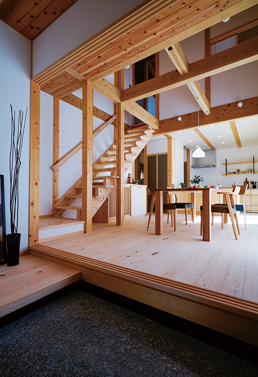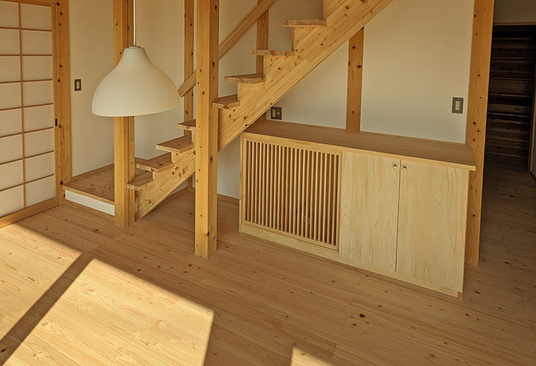 「雨楽な家・景」豊田モデルハウスは、樹脂サッシと高性能断熱材を採用した、省エネ等級5の建物です。吹抜けのある開放的なダイニングキッチンには、空気の流れを考慮して、「床置きエアコン」を1台配置しています。木をふんだんに使用した「雨楽な家」は熱の保温効果も高いため、この1台の床置きエアコンでDK、リビング、2階ホールなどを賄っています。特に、無垢の桧を使用した床材は、足元からの冷たさを感じにくく、省エネ住宅と木の家はとても相性がいいと実感しています。